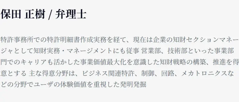 主な得意分野は、論理的思考に基づいたソフトウェアや機械系技術分野の発明を扱う特許関係。